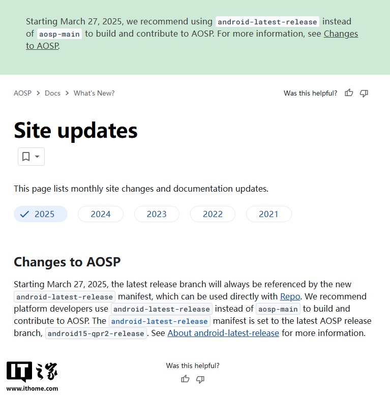 此外,谷歌也表示新“android-latest-release”清单将始终引用最新的 AOSP 发布分支,建议开发者使用“android-latest-release”而非“aosp-main”。