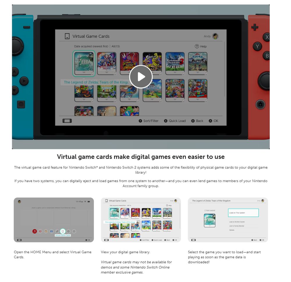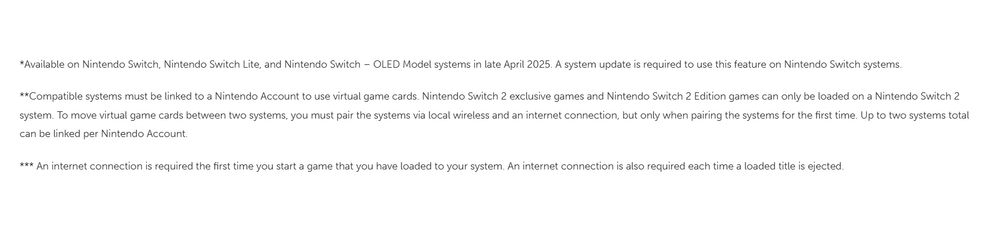 使用虚拟游戏卡的设备必须关联任天堂账号,而任天堂 Switch 2 独占游戏以及“任天堂 Switch 2 版”游戏仅能在任天堂 Switch 2 系统上加载运行。