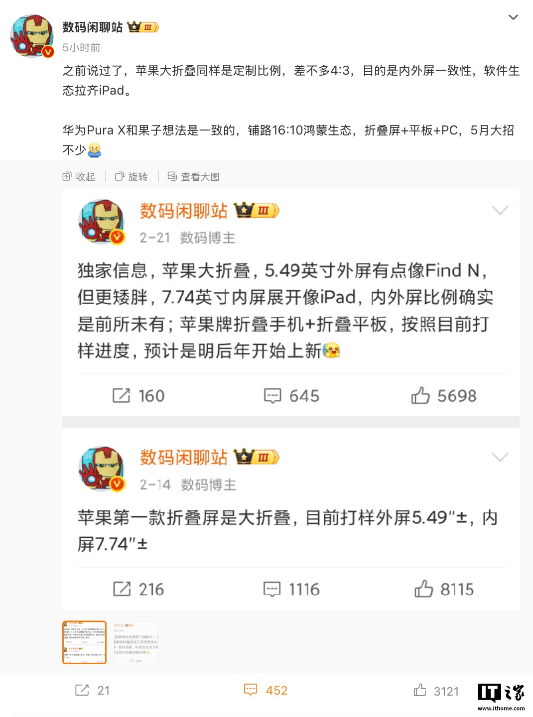IT之家 3 月 28 日消息,博主 @数码闲聊站 发文,透露苹果大折叠 iPhone 将采用定制比例,整体尺寸为 4:3,目的是实现“内外屏一致性”,令“软件生态拉齐 iPad”。