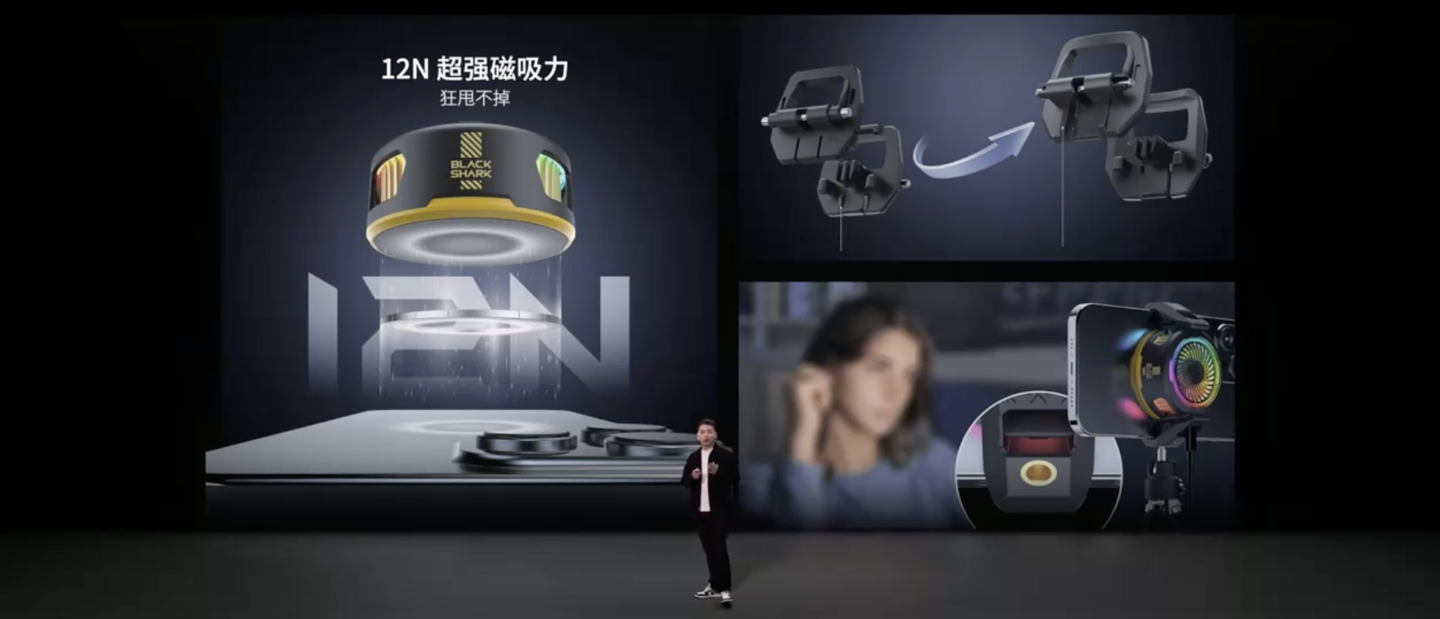 系列磁吸制冷背夹附赠可拆卸抓手,适用于不支持磁吸的手机,抓手配备 1/4 螺口支持直播三脚架。同时配有实体模式按钮,可一键切换静音模式 / 超频模式等。Pro 版制冷背夹支持黑鲨装备箱 App 调参。