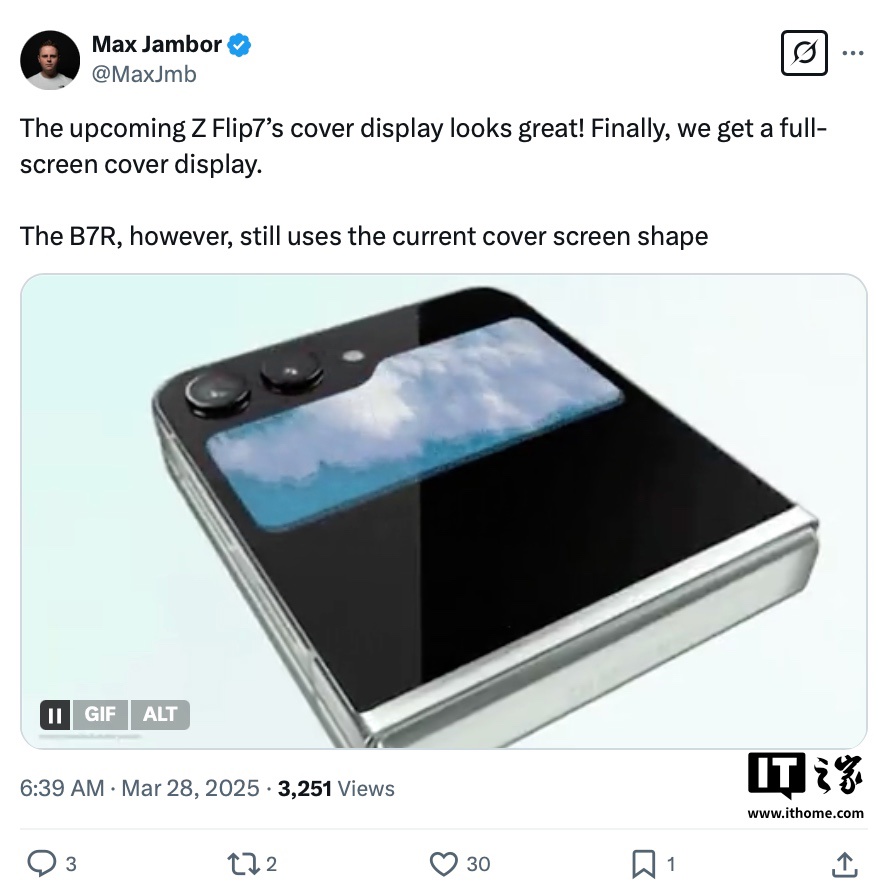 IT之家 3 月 28 日消息,综合消息源 Max Jambor 和 OnLeaks 爆料,三星 Galaxy Flip7 小折叠手机将采用“全面屏”风格外屏,整体风格类似联想的 moto razr 50 Ultra 手机,另有一款 Galaxy Z Flip FE 机型将延续目前 Galaxy Flip6 的“文件夹”风格外屏设计。