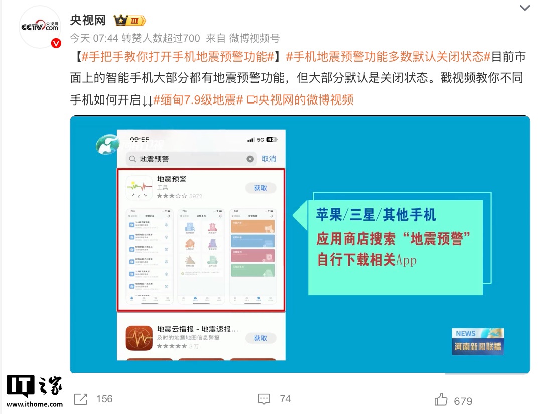 相应地震引发社交媒体上对于手机地震预警功能的广泛讨论,对此,央视网援引河南卫视视频,表示目前市面上的智能手机大部分都有地震预警功能,但大部分默认是关闭状态,用户应当手动开启相应“地震预警”功能。