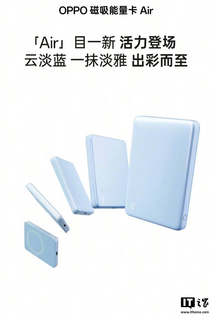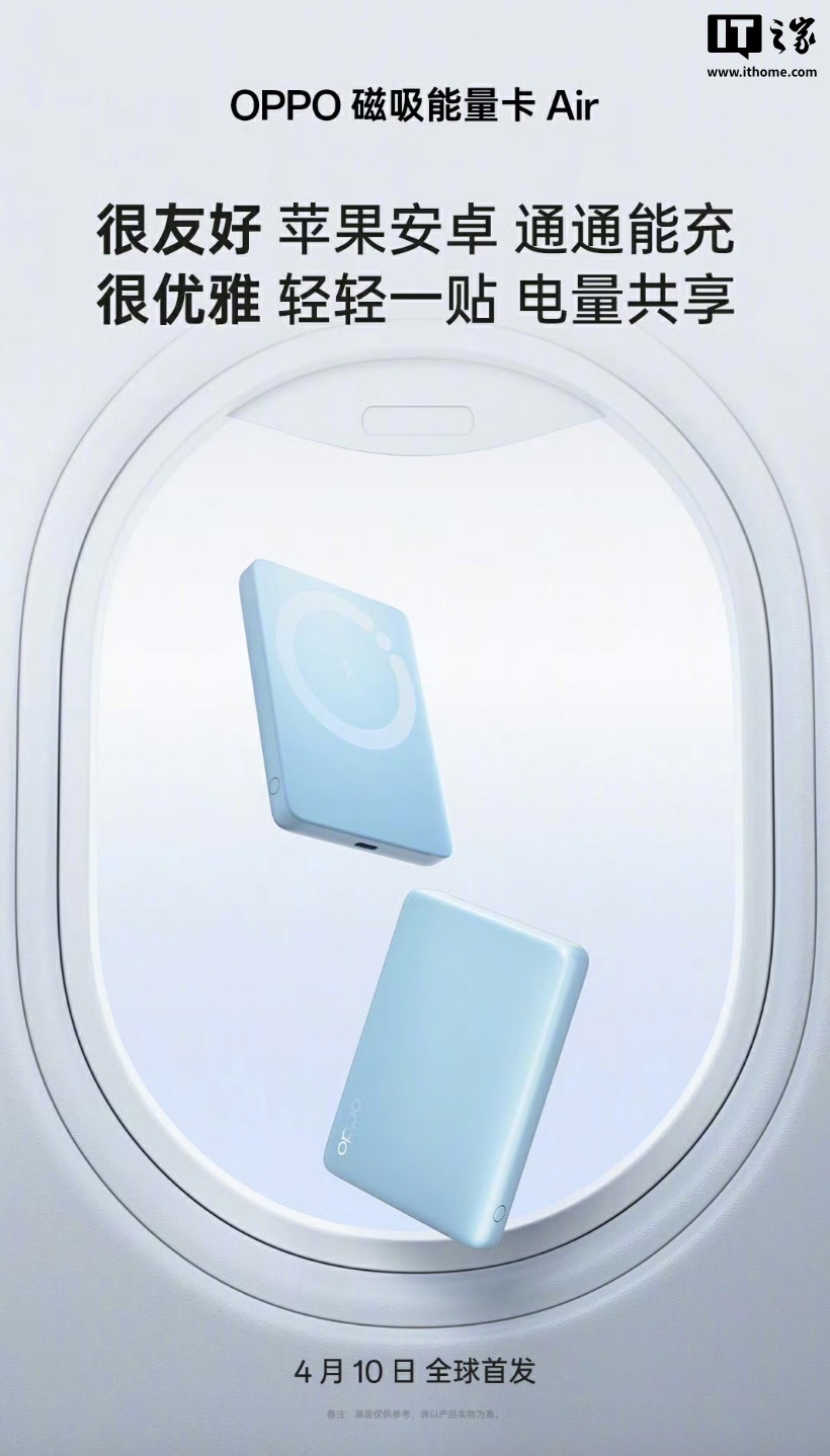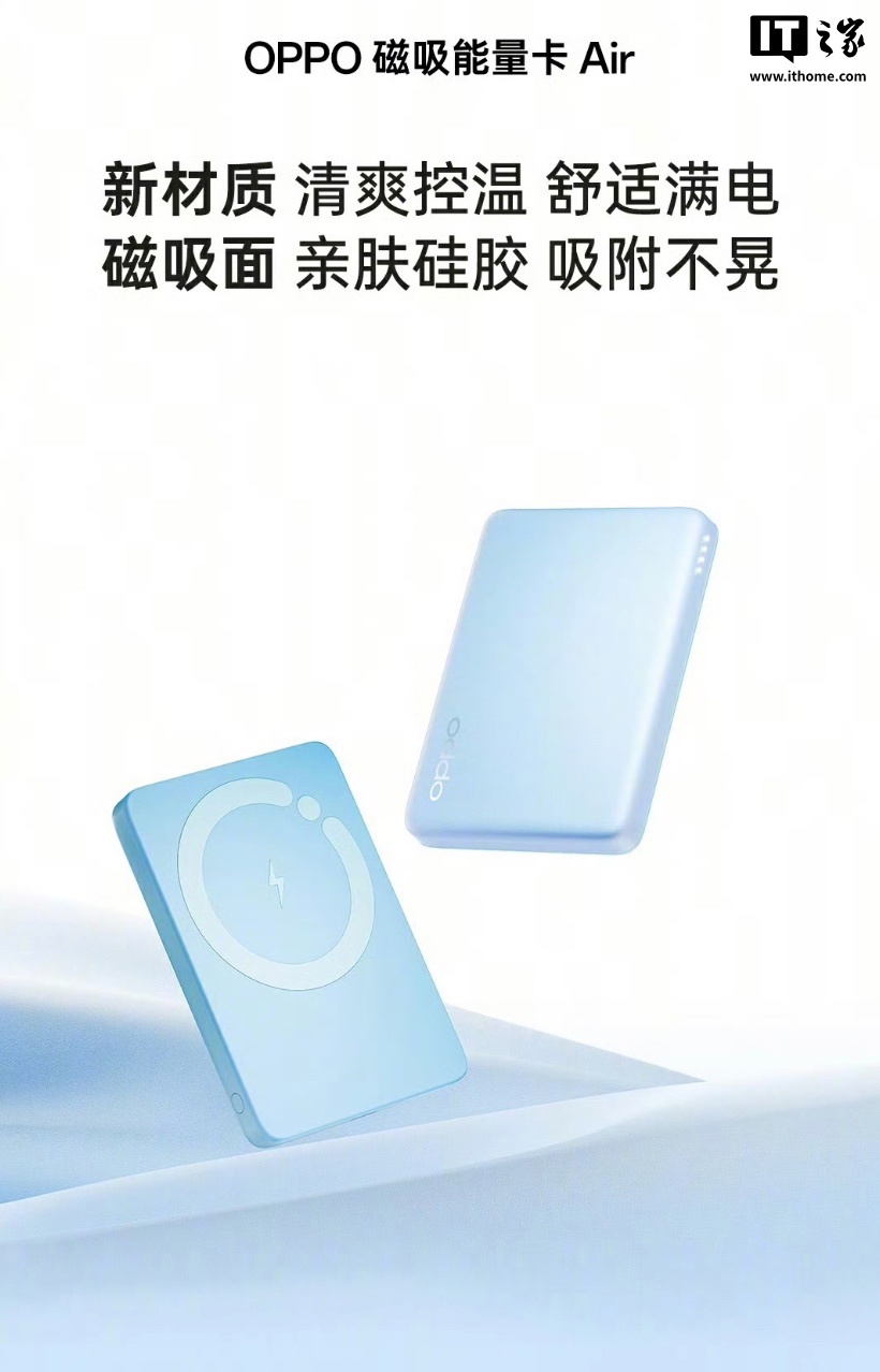IT之家 3 月 29 日消息,OPPO 今天预热了旗下 OPPO 磁吸能量卡 Air 移动电源,这款移动电源容量为 5000 毫安时,相比在售现款预计厚度变薄,将于 4 月 10 日发布。