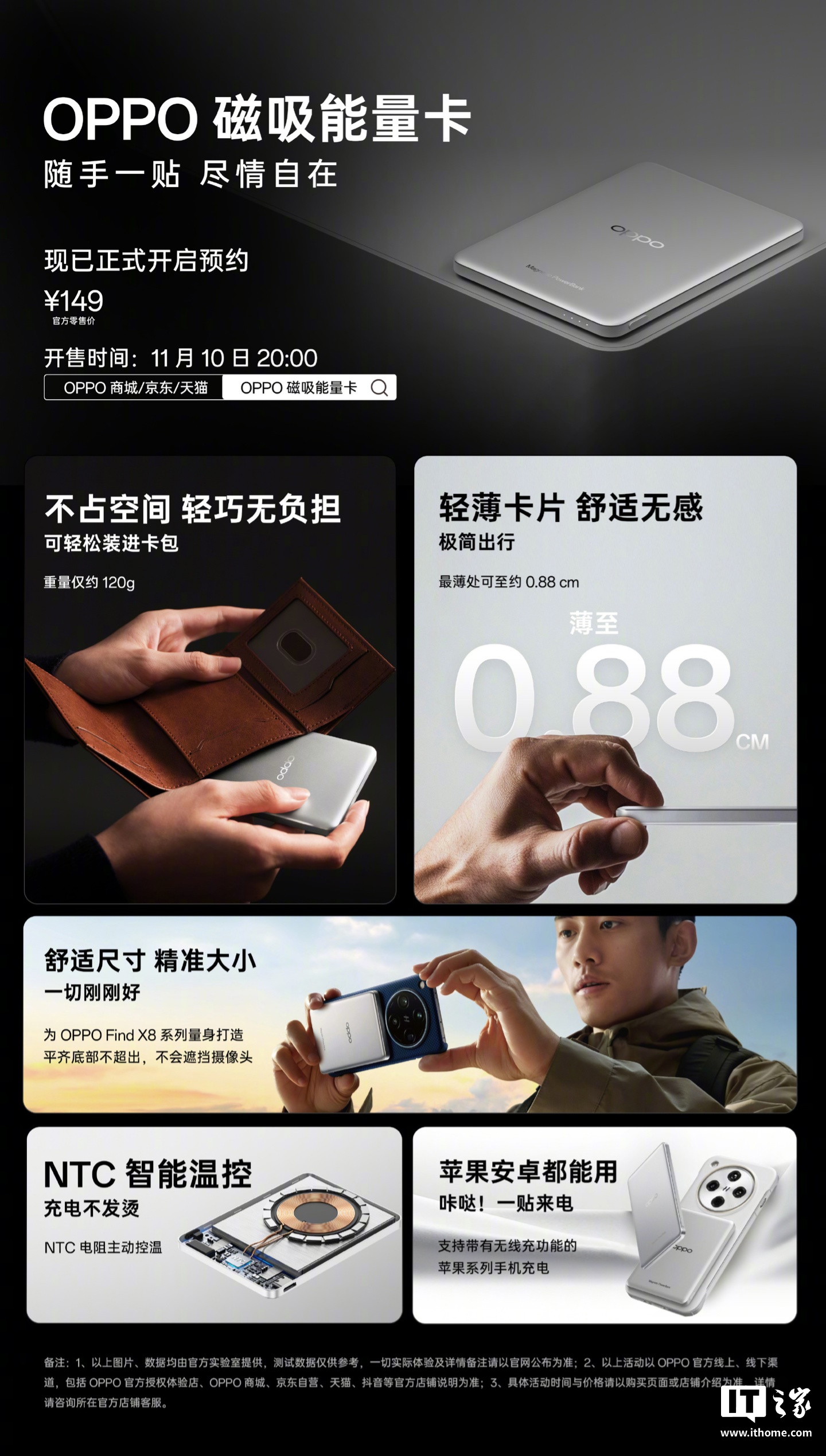 作为比较,IT之家获悉目前在售标准款 OPPO 磁吸能量卡于去年 11 月上市,定价为 149 元,其同样拥有 5000mAh 电池容量,整体厚约 0.88cm、重约 120g,采用金属外观 + CNC 高亮边框设计。