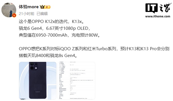 此外,该博主还爆料称,OPPO 想把 K 系列对标 iQOO Z 系列和红米 Turbo 系列,预计 K13 和 K13 Pro 会分别搭载天玑 8400 和骁龙 8s Gen4。