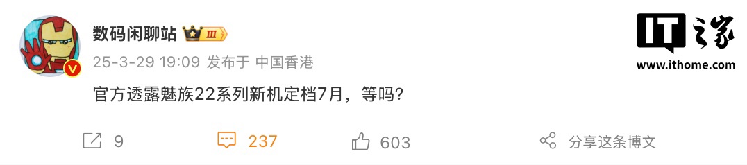 IT之家 3 月 29 日消息,博主 @数码闲聊站 发文,称“官方透露魅族 22 系列新机定档 7 月”,不过其暂未公布系列手机具体规格信息。