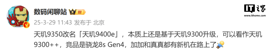 也许是受到 iPhone 16e 命名的启发,也可能是汲取了 PC 行业英特尔和 AMD 的命名方式,博主 @数码闲聊站 的最新爆料显示原本的“天玑 9350”已经改名为“天玑 9400e”了。