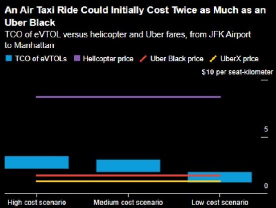 根据彭博模型,在先进空中出行市场早期阶段可能出现的高运营成本情景下,从纽约肯尼迪机场到曼哈顿西区,eVTOL行程的总拥有成本(TCO)为2.60-3.70美元/座位千米。这比同路线的高端服务Uber Black价格高出55%-125%。