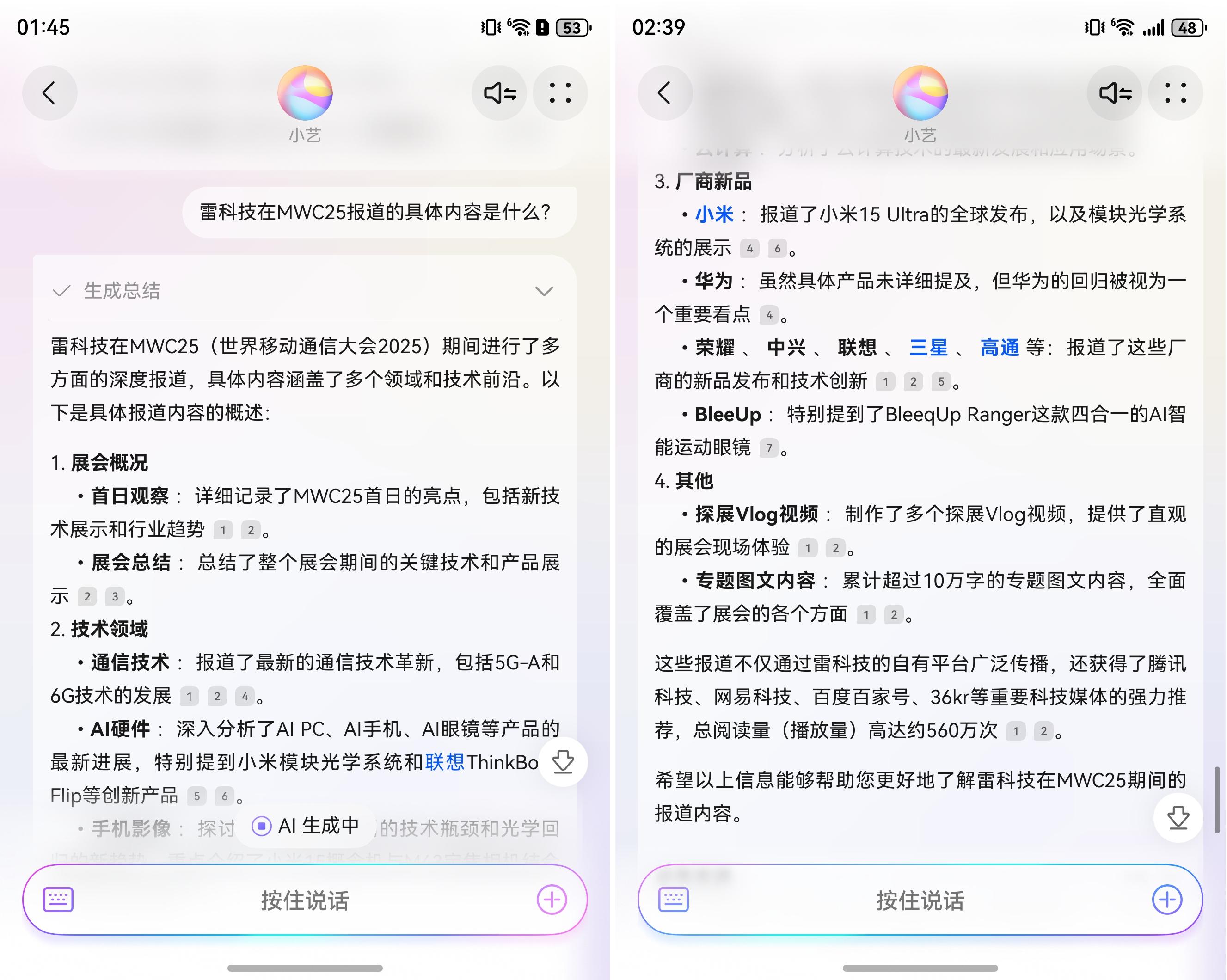 例如当小雷询问雷科技在 MWC25 期间的报道内容时,它就会结合网络上的各种文章链接对多篇报道文章进行一个简单的总结,让用户能够快速了解到 MWC25 期间发布了哪些有意思的产品。