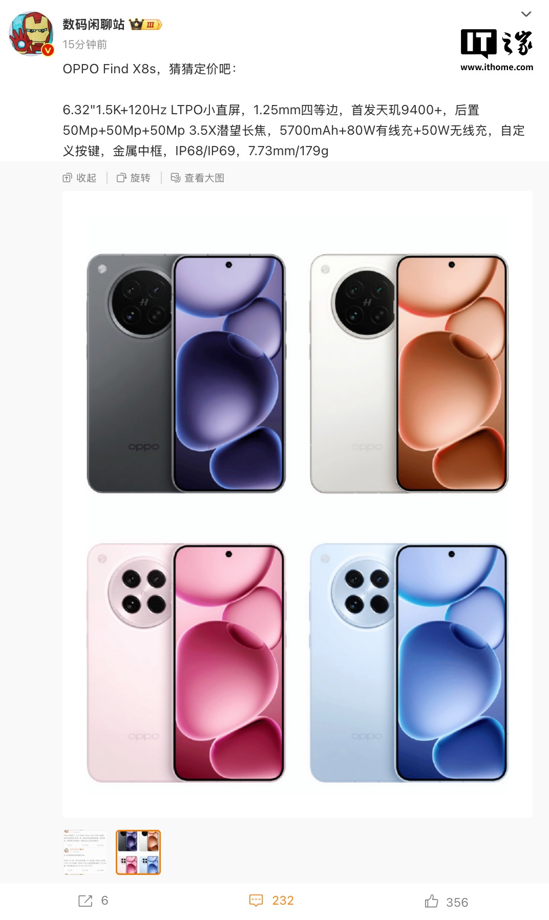 IT之家 3 月 31 日消息,博主 @数码闲聊站 现已公布 OPPO Find X8s 小屏手机的完整规格信息,IT之家综合官方此前预热汇总该机具体参数如下。