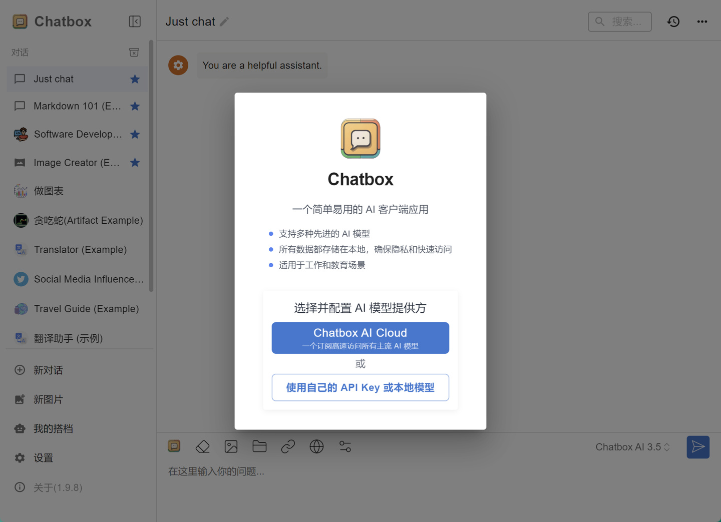 如果对浏览器的对话插件满意,就不用看这一部分了,如果使用的不是上述两个浏览器,抑或是对浏览器的交互方式不甚喜欢,那么也可以选择 ChatBox AI 作为交互入口。可以从官网自行下载。