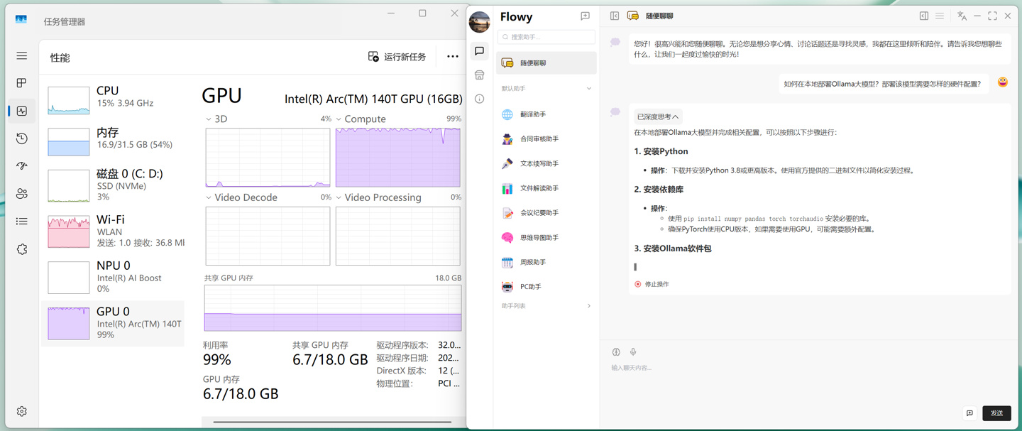下载完成后在 Flowy AIPC 助手中提问,可以看到同样调用了 Arc 核显的计算模块进行加速。