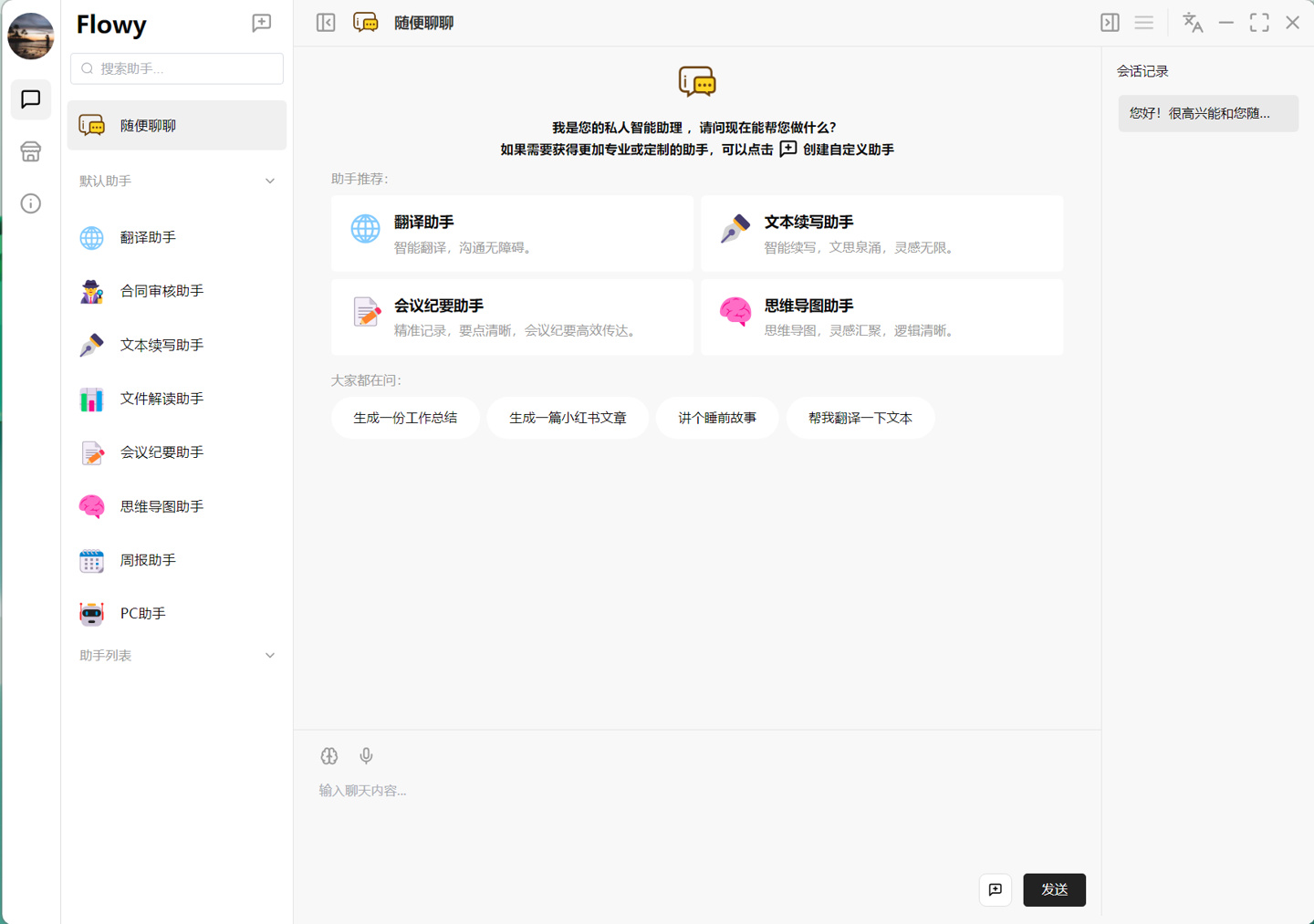 下载完成后,回到主界面就可以选择模型开始对话了,这里需要注意的是,除了本地模型,Flowy AIPC 助手还提供了云端模型可选,选择的时候要注意区分前面的小图标,分辨本地模型和云端模型。