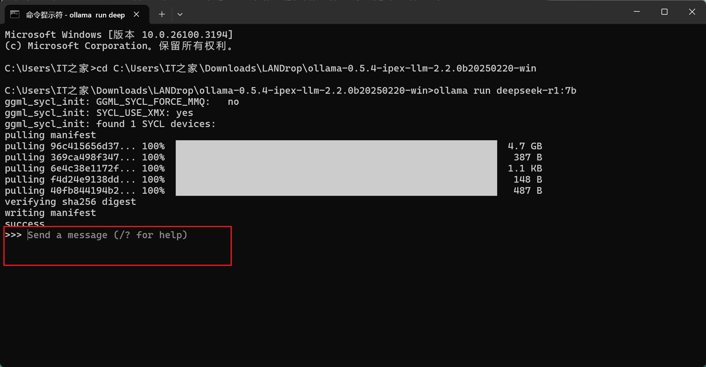 cd CUsersIT之家 DownloadsLANDropollama-0.5.4-ipex-llm-2.2.0b20250220-win ollama run deepseek-r1:7b