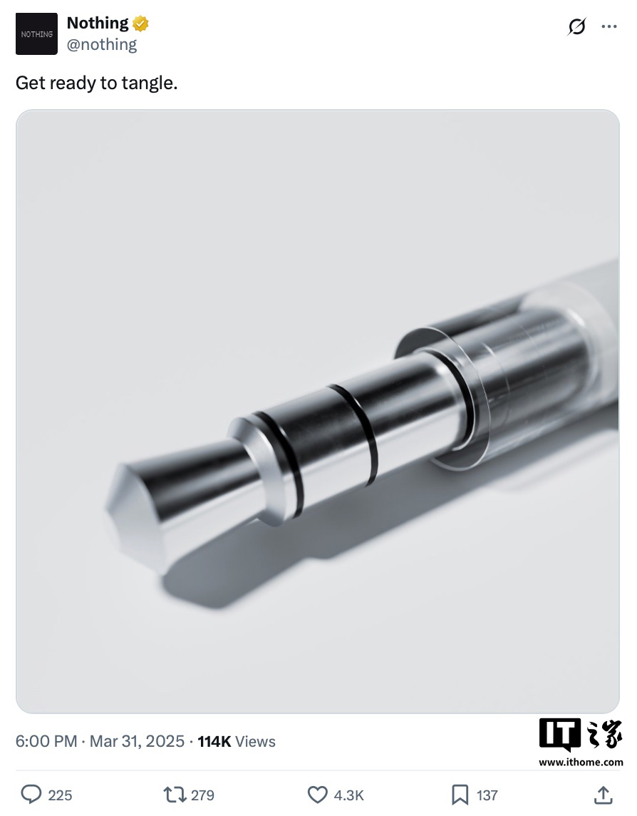IT之家 3 月 31 日消息,Nothing 在 X 平台发文,展示了一款带有 3.5mm 插头的神秘音频产品。参考评论区,目前用户大多认为该产品有望为有线耳机,但也有可能是愚人节玩笑产品。