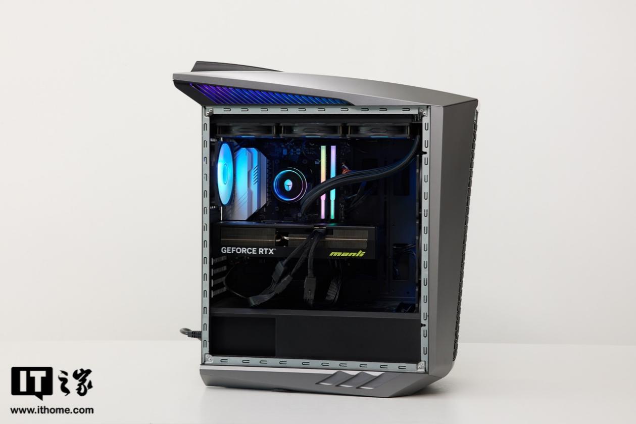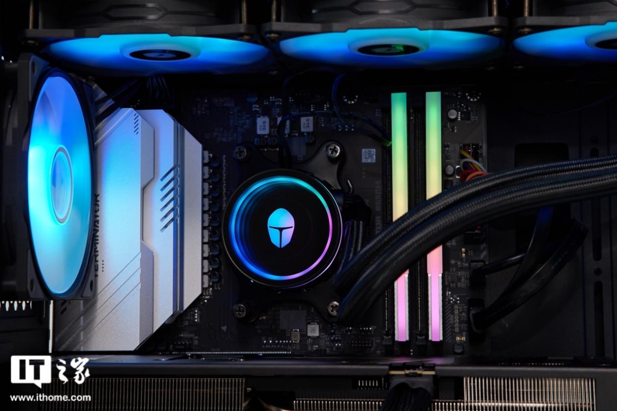 风扇灯光默认为蓝色,契合雷神品牌主题色,水冷和内存灯光则为幻彩色,内存条顶部灯带做了半透明亚克力柔光罩,因此灯光色彩过渡更加平滑。显卡部分则比较低调,没有做灯光设计。
