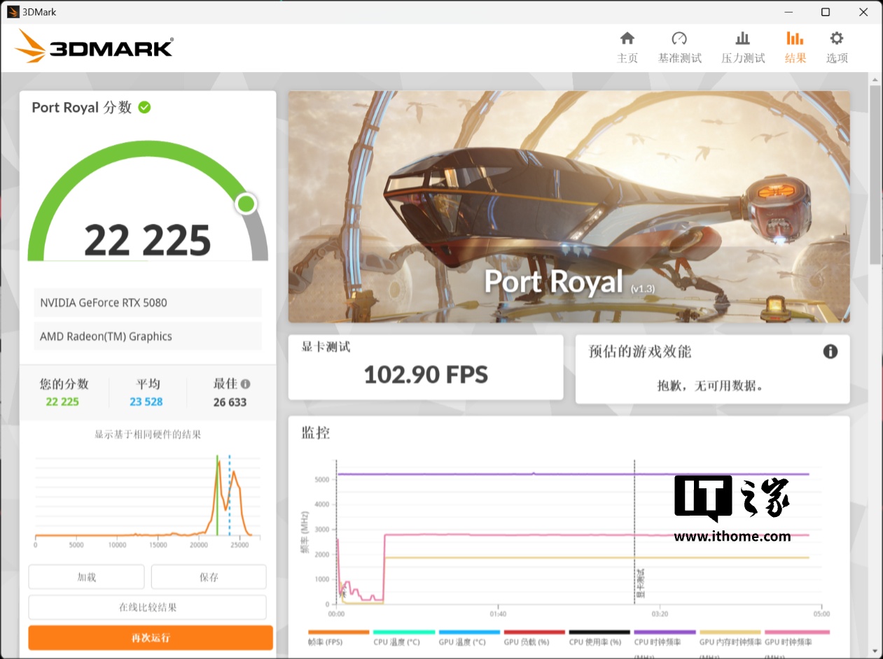 在 3DMark Portal Royal 实时光追测试中,RTX 5080 拿到了 22225 分的显卡分数,作为对比 GeForce RTX 4080 SUPER 公版显卡的分数为 18439 分,性能提升幅度约 20.5%。毫无疑问在理论性能测试中,雷神黑武士 Shark 游戏主机所搭载的锐龙 7 9800X3D 和 NVIDIA GeForce RTX 5080 显卡都能发挥出应有的性能水平。