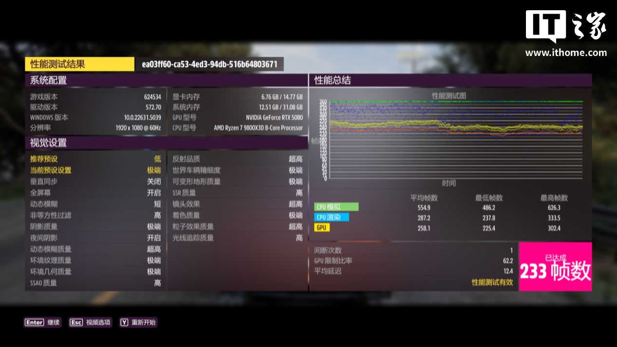 《极限竞速:地平线 5》这款游戏非常吃显存,也能考验锐龙 7 9800X3D 在 1080P 分辨率下的性能上限。以 1080P + 极端画质,运行游戏自带基准测试,游戏平均帧数为 233 帧,1% Low 帧 169 帧。这个表现和IT之家之前在 B850 主板上的成绩一模一样。