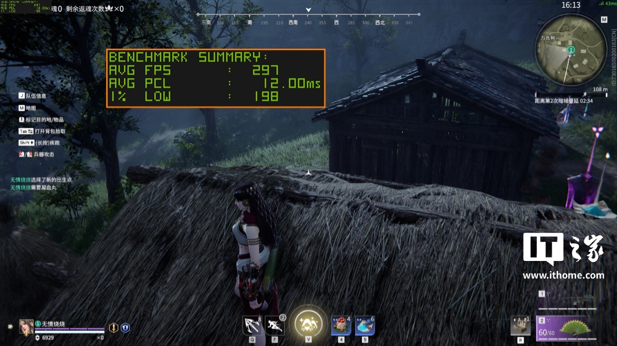 在 1080P 分辨率 + 超级画质下,运行游戏自带基准测试,游戏平均帧数 214 帧;