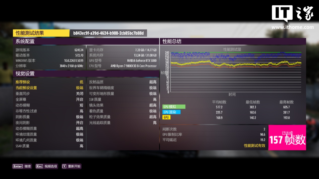 而在 4K 分辨率 + 极端画质下,游戏平均帧数为 157 帧,1% Low 帧 128 帧,基本可以跑满 4K / 160 帧的电竞显示器。