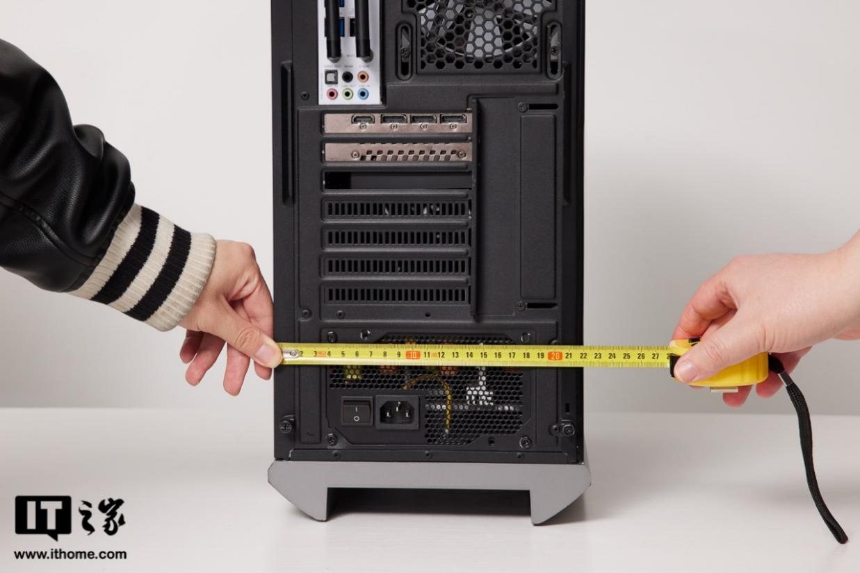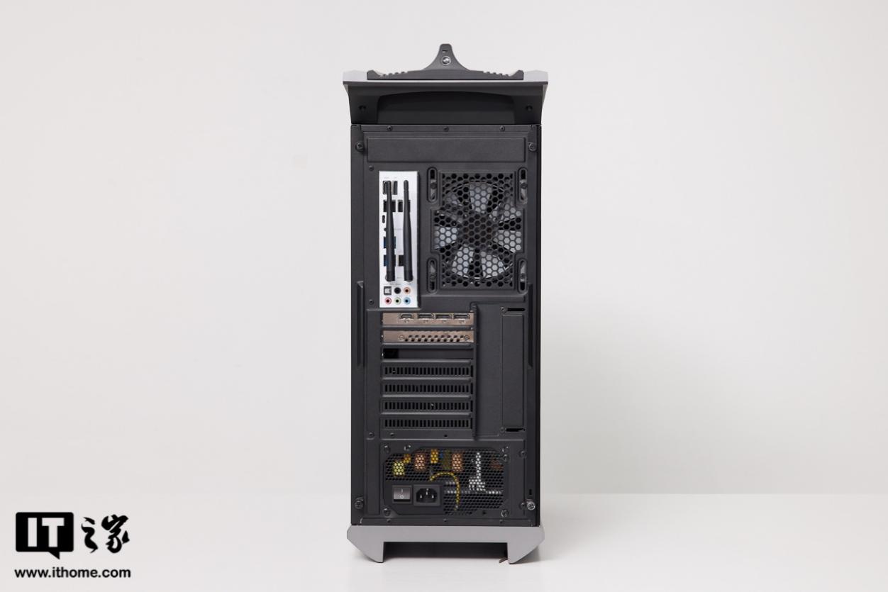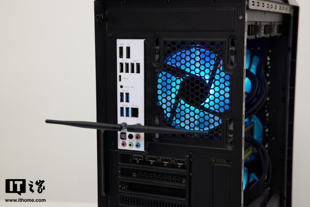 机箱背部做了黑化处理,但主板部分的 I/O 接口面板为白色,有利于用户寻找接口。