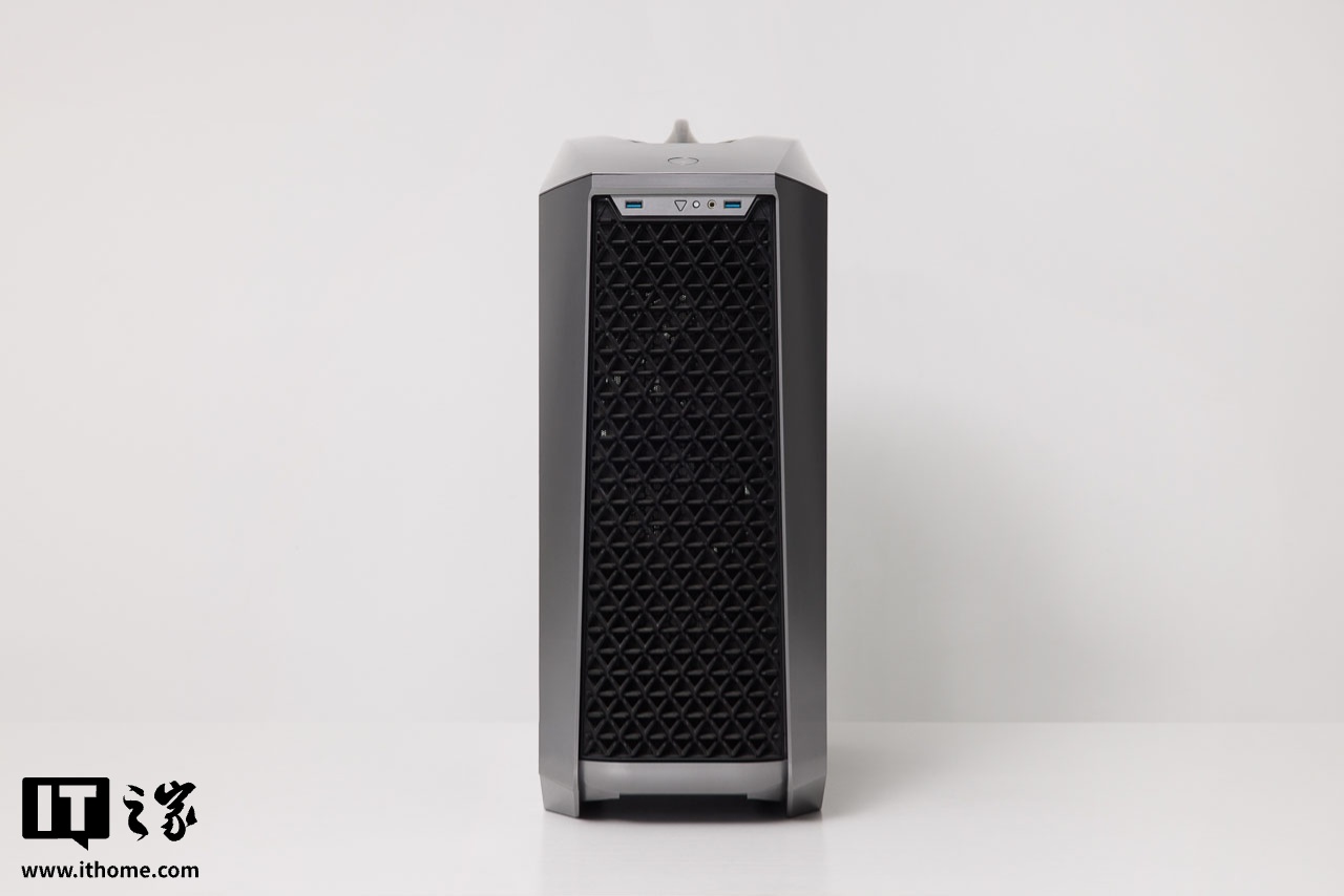 而机箱前面板也设计了大面积的黑色三角网格,开机时便会透过镂空部分展现出机箱内部前侧三风扇的 RGB 灯效,很有感觉。