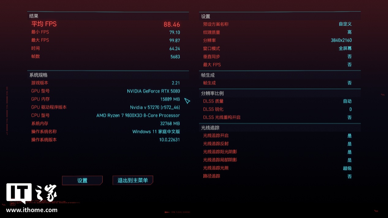 在 4K 分辨率 + 超级光追画质 + DLSS 自动档 + 帧生成下,游戏平均帧数 88 帧;