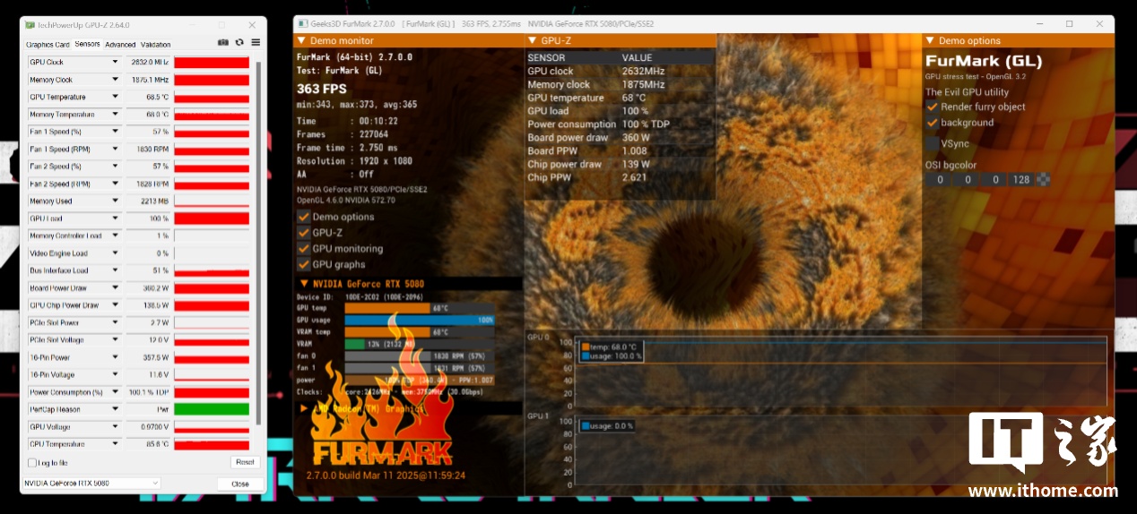 而显卡单烤 10 分钟甜甜圈,风格则完全不同。显卡功耗吃满 360W,此时的 GPU 运行频率也达到了 2632MHz,但显卡温度和显存温度分别只有 68.5°C 和 68°C,说明机箱内的散热做得不错。