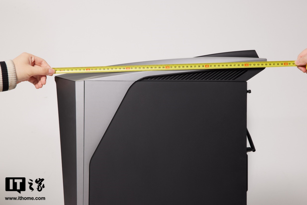 尺寸方面,雷神黑武士 Shark 游戏主机的机箱非常大,具体三维经过IT之家手动测量,大概是 550*220*595mm,很明显是 ATX 机箱才有的尺寸。其内部最大自持 400mm 的长显卡,电源位也是 ATX 尺寸,还有 7 个 120mm 风扇位和 2 个 HDD 硬盘扩展位(2.5/3.5 寸硬盘均支持)