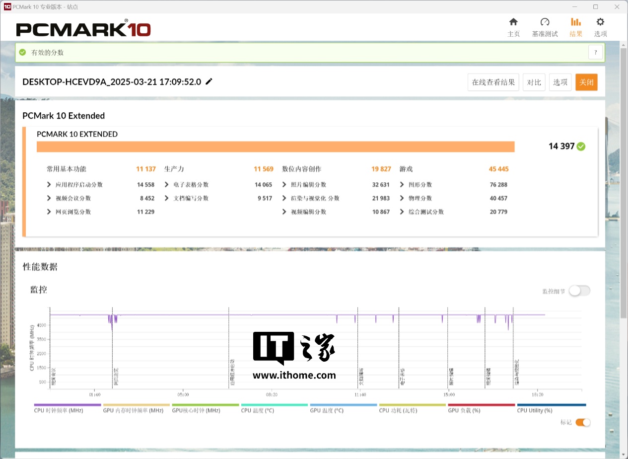 第一个项目我们选择了 PC Mark 10 Extended 基准测试,不仅包含了现代办公基准测试中的三个子项目还新增了游戏项目,最终雷神黑武士 Shark 游戏主机综合得分 14397 分,游戏项目得分超过 45000 分,日常办公性能无可挑剔。