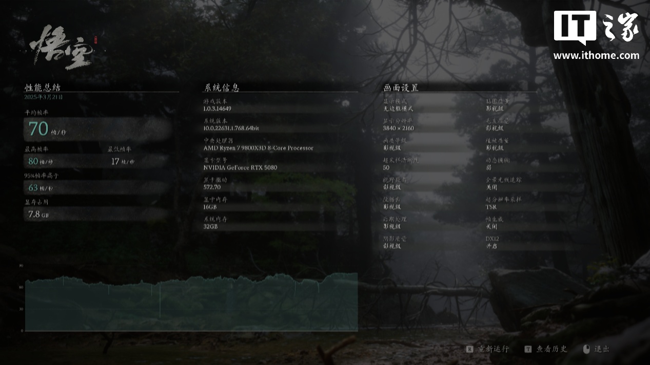 在 4K 分辨率 + 影视级画质 + 超高全景光线追踪 + DLSS + 帧生成 + 50% 超采样设置下,游戏平均帧数 88 帧,1% Low 帧 73 帧。有了 DLSS 技术的加持,《黑神话:悟空》总算被锐龙 7 9800X3D + RTX 5080 驾驭住了,超高光追下也能拥有很好的游戏体验。