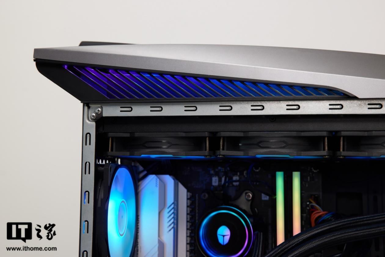 首先,机箱顶部做了一个类似鲨鱼背鳍造型的设计,看起来非常霸气。背鳍两侧分别做了一道斜切格栅带,可以透出机箱内部的灯光。这个鲨鱼鳍灯带设计可以算作是本次设计上的彩蛋,默认蓝紫色的灯光有“怒海狂鲨,冲锋破浪”的寓意。