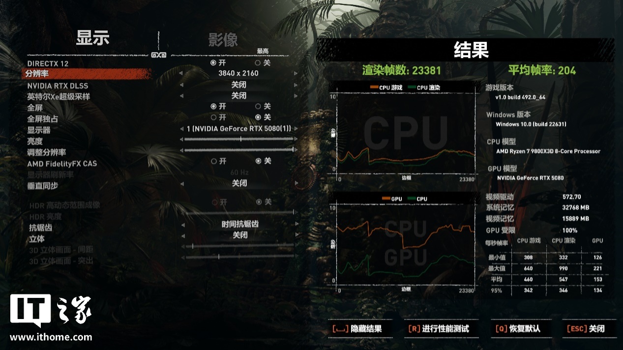 切换到 4K 分辨率 + 最高画质,游戏平均帧数 204 帧,1% Low 帧 172 帧。这个表现没什么好说的,毕竟《古墓丽影:暗影》算是优化不错的老游戏了。