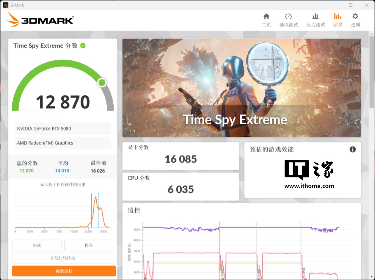 在 Time Spy Extreme 的测试中,RTX 5080 拿到了 16085 分的显卡分数,作为对比 GeForce RTX 4080 SUPER 公版显卡的分数为 14541 分,性能提升幅度约 10.6%。