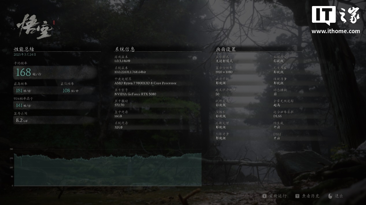 在 1080P 分辨率 + 影视级画质 + 超高全景光线追踪 + DLSS + 帧生成 + 50% 超采样设置下,游戏平均帧数为 168 帧,1% Low 帧为 115 帧。