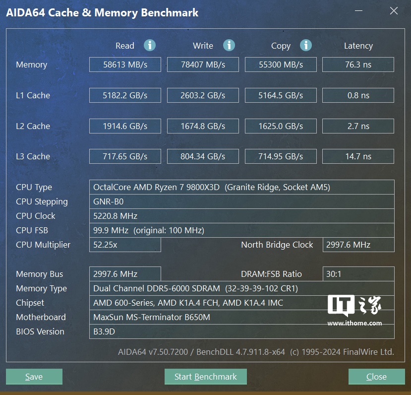 我们在主板 BIOS 中开启 EXPO 和内存低延迟选项后,通过 AIDA64 的内存测试项目进行跑分,如图所示此时的内存时序为(32-39-39-102 CR1)读取拷贝速度都在 55000MB/s 以上,写入速度可达 78407MB/s,内存延迟为 76.3ns。速度属于平均水平,而内存延迟相比同频率和时序下英特尔平台下的内存延迟降低了 14%。
