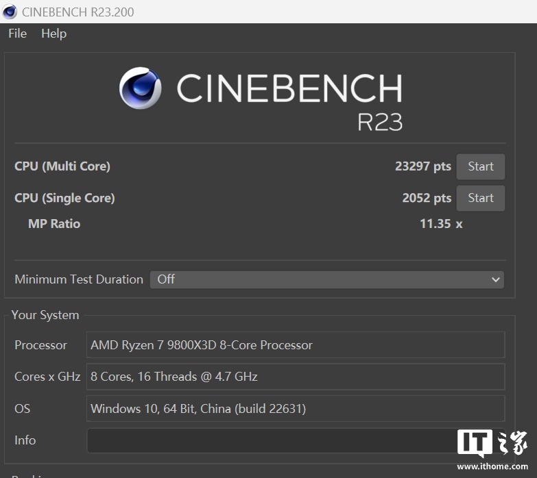 在 CineBench R23 的测试中,锐龙 7 9800X3D 的 CPU 单核成绩为 2052 分,多核成绩为 23297 分,与我们之前评测过的 B850 主板成绩基本相同,单核分数甚至还高出了 30 分。