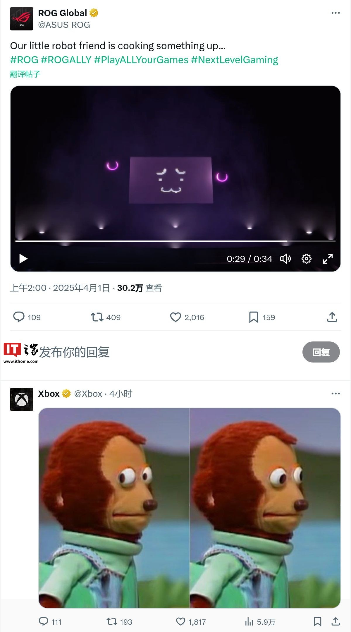 IT之家 4 月 1 日消息,华硕 ROG 玩家国度官方账户今日在 X 平台预热新款 ROG Ally 系列掌机设备,值得注意的是微软 Xbox 官方也在该动态下方进行了玩梗式回应,预计新设备即此前传闻中的双方合作款 Project Kennan。