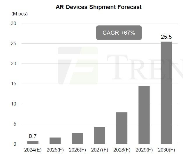 IT之家援引博文介绍,2024 年 AR 设备出货量预计为 70 万台,但到 2030 年将飙升至 2550 万台,年均增长率高达 67%。Meta 虽暂未推出正式 AR 产品,但其 Ray-Ban 智能眼镜已售出超百万台,开发者版 Orion AR 眼镜预计 2027 年面世。