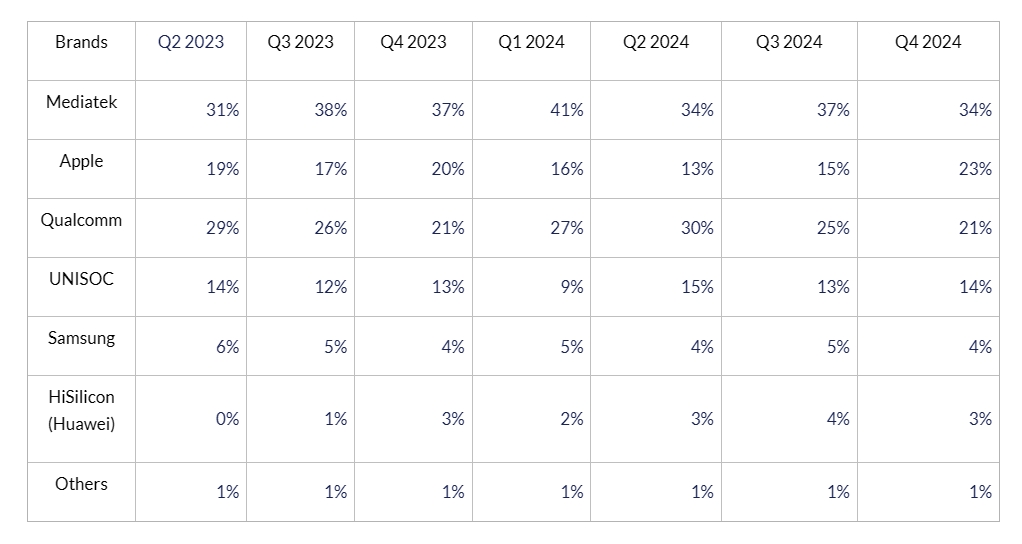 排名第二的苹果,得益于iPhone新机在2024年四季度的大量出货,推动苹果A系列处理器出货量在该季快速增长,其市场份额也由三季度的15%上升至23%。