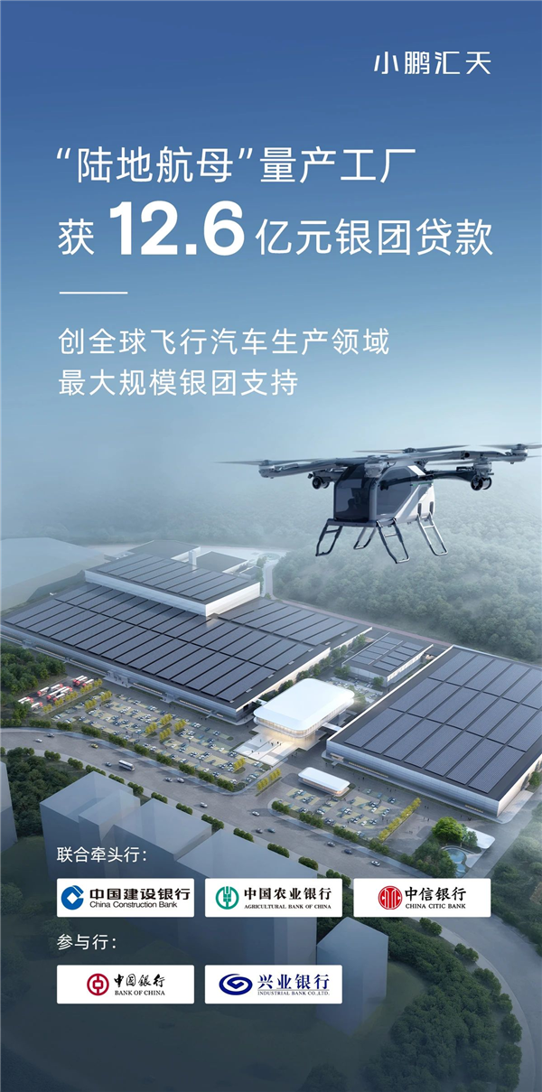 据介绍,近日,小鹏汇天与中国建设银行、中国农业银行、中信银行、中国银行、兴业银行等多家银行签约,五家银行联合向小鹏汇天提供12.6亿元银团贷款,用于支持小鹏汇天飞行汽车智造基地的建设。