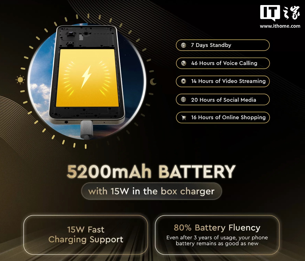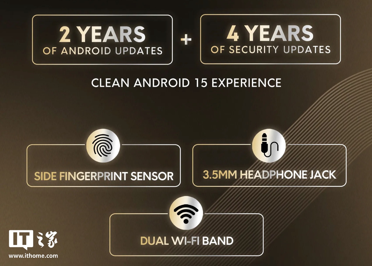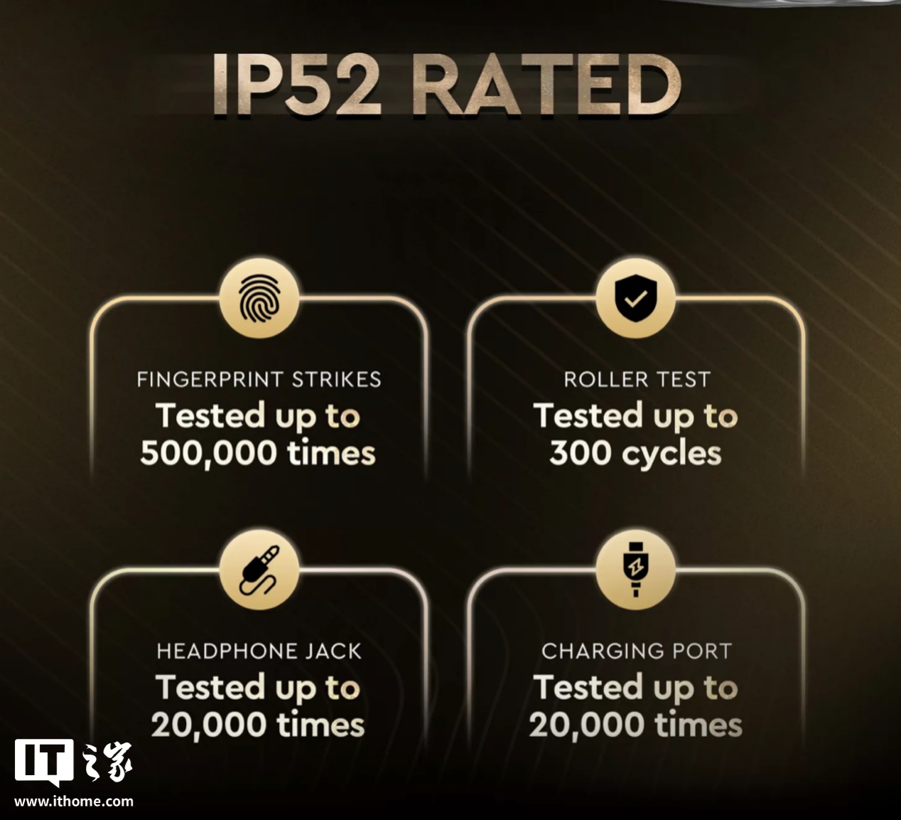 IT之家了解到,该机将获得 2 次安卓大版本更新(首发搭载 Android 15)+4 年安全更新支持,同时根据该零售商所述,该手机通过了 IP52 认证,耳机孔和充电口都通过了 20000 次插拔测试。
