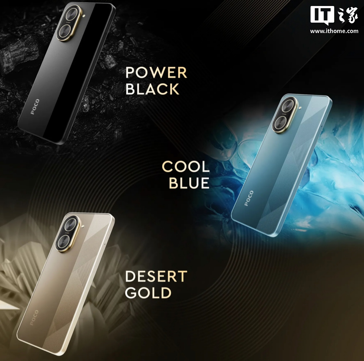 根据该零售商的宣传图,小米 POCO C71 手机主打性价比配置,该手机在外观上与母品牌同款机型 REDMI A5 略有不同,提供“能量黑”、“冰河蓝”和“沙漠金”三种配色,其中“能量黑”和“冰河蓝”配色背板采用“分格纹”设计,后摄模组外观接近,但所有配色的摄像头装饰环新增了更多的金色元素。
