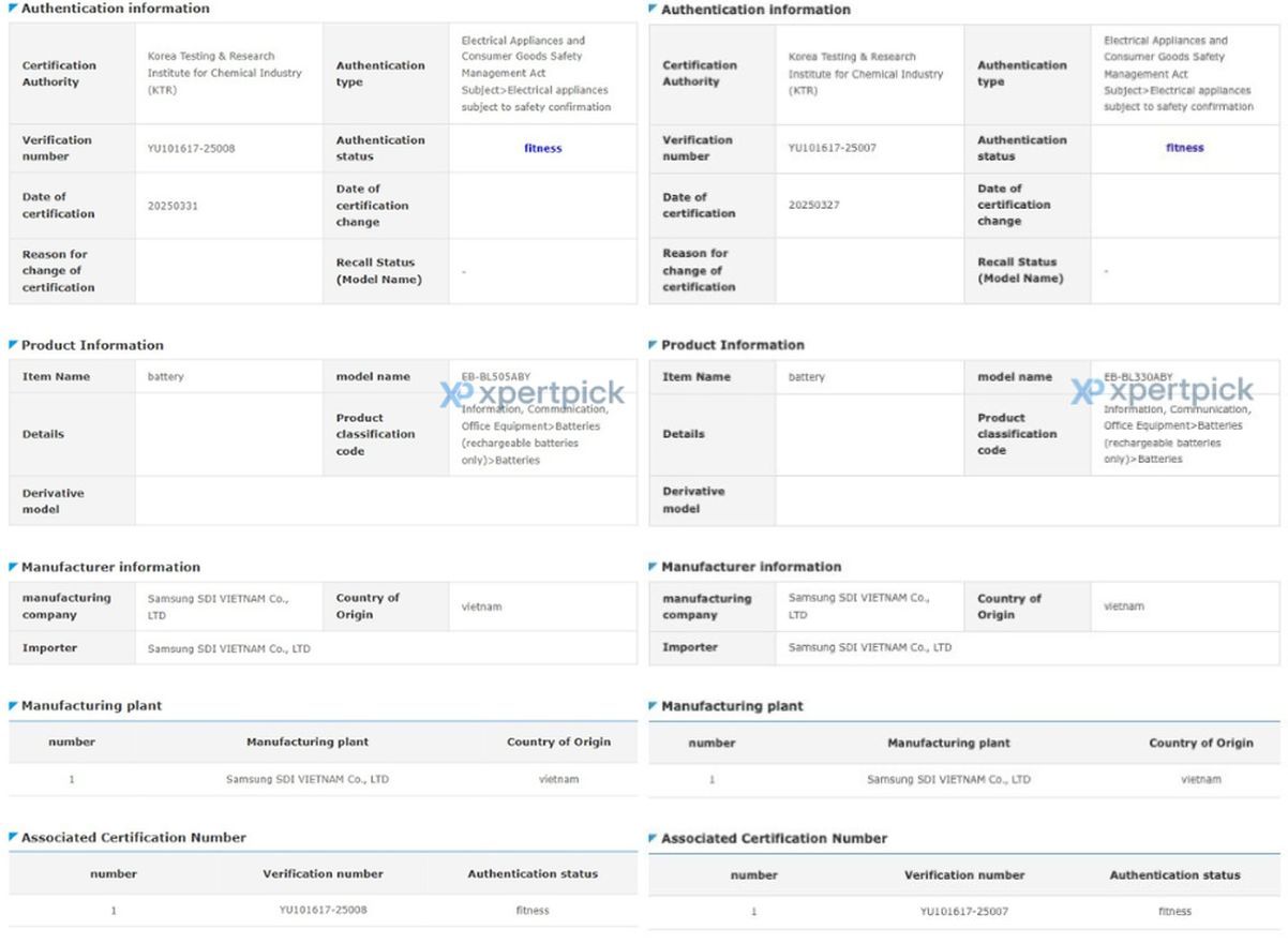 韩国 SafetyKorea 认证机构近日通过了两款电池 EB-BL330ABY 和 EB-BL505ABY 的审核,前者已确认容量为 435mAh,后者容量暂未披露。这两款电池分别对应 Watch 8(SM-L330)和 Watch 8 Classic(SM-L505)。