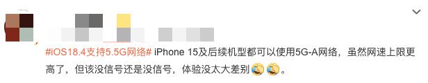 “ iPhone 15 及后续机型都可以使用 5G-A 网络,虽然网速上限更高了,但该没信号还是没信号,体验没太大差别。 ”
