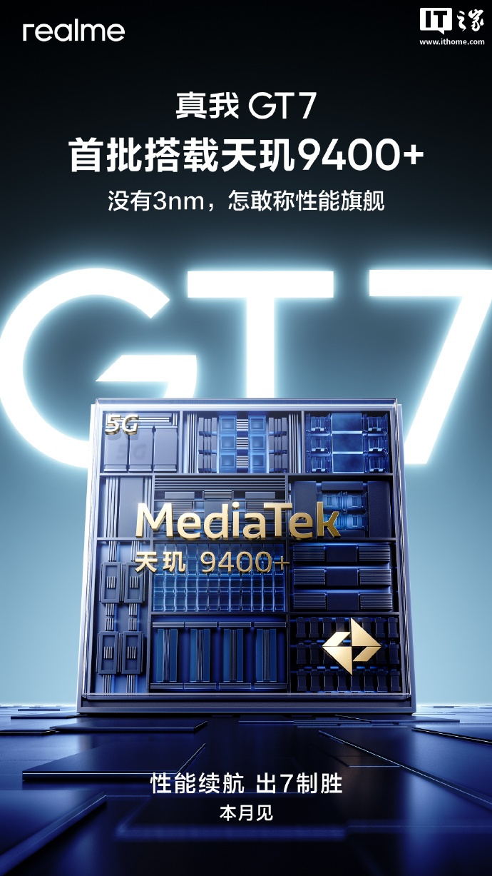 IT之家 4 月 2 日消息,真我手机官方宣布,真我 GT7 手机首批搭载联发科天玑 9400 + 旗舰芯,将于本月发布。
