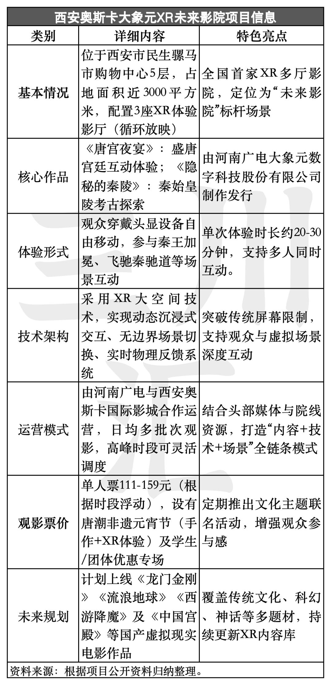 2025年1月,河南广电与奥斯卡国际影城合作的大象元XR未来影院落户西安,成为全国首家完全国产化的XR多厅沉浸式影院。该影院位于西安民生骡马市购物中心, 占地面积近3000平方,配备三座体验影厅,循环放映《唐宫夜宴》《隐秘的秦陵》等作品,观众可穿戴设备探索秦始皇陵内部构造或参与秦王加冕仪式。 未来计划上线《龙门金刚》《流浪地球》等XR影片,持续丰富内容矩阵。