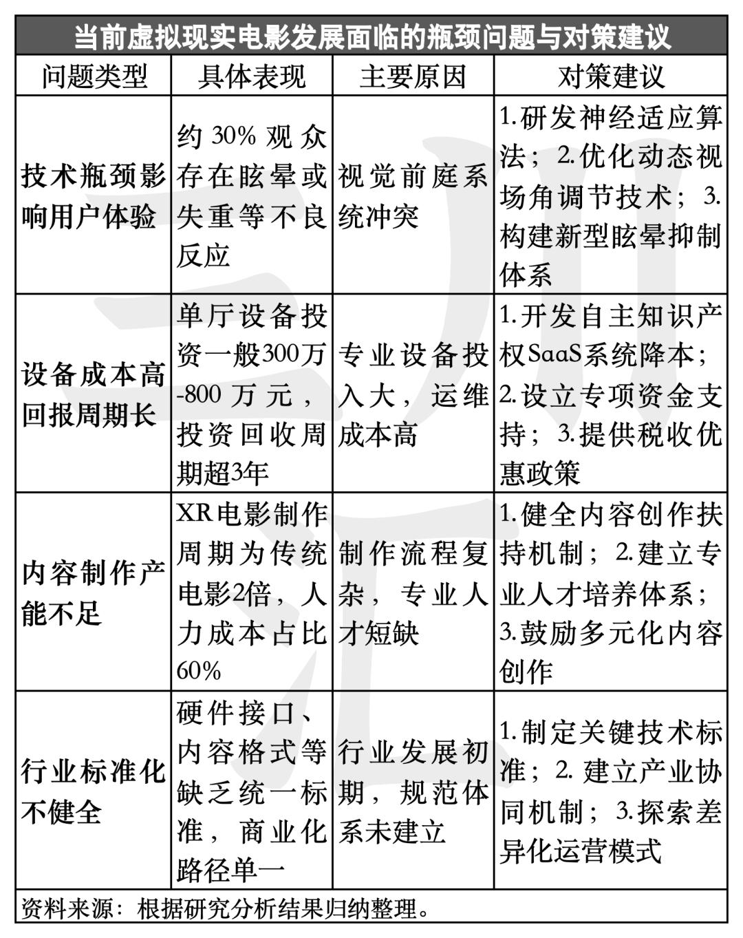 综上所述,尽管当前政策为虚拟现实电影提供发展机遇,但仍然面临多重发展瓶颈: 技术体验方面,约30%用户反馈存在眩晕不适感,需要开发新型抗眩晕抑制技术来改善;成本投入方面,VR影院单厅设备成本高,投资回报周期普遍超过3年,对商业模式创新提出了更高要求;内容生产方面,XR电影平均制作周期是传统电影的2倍,人力成本占比高达60%,产能瓶颈明显;标准建设方面,硬件接口、内容格式等关键技术标准尚未统一,产业协同机制有待完善。