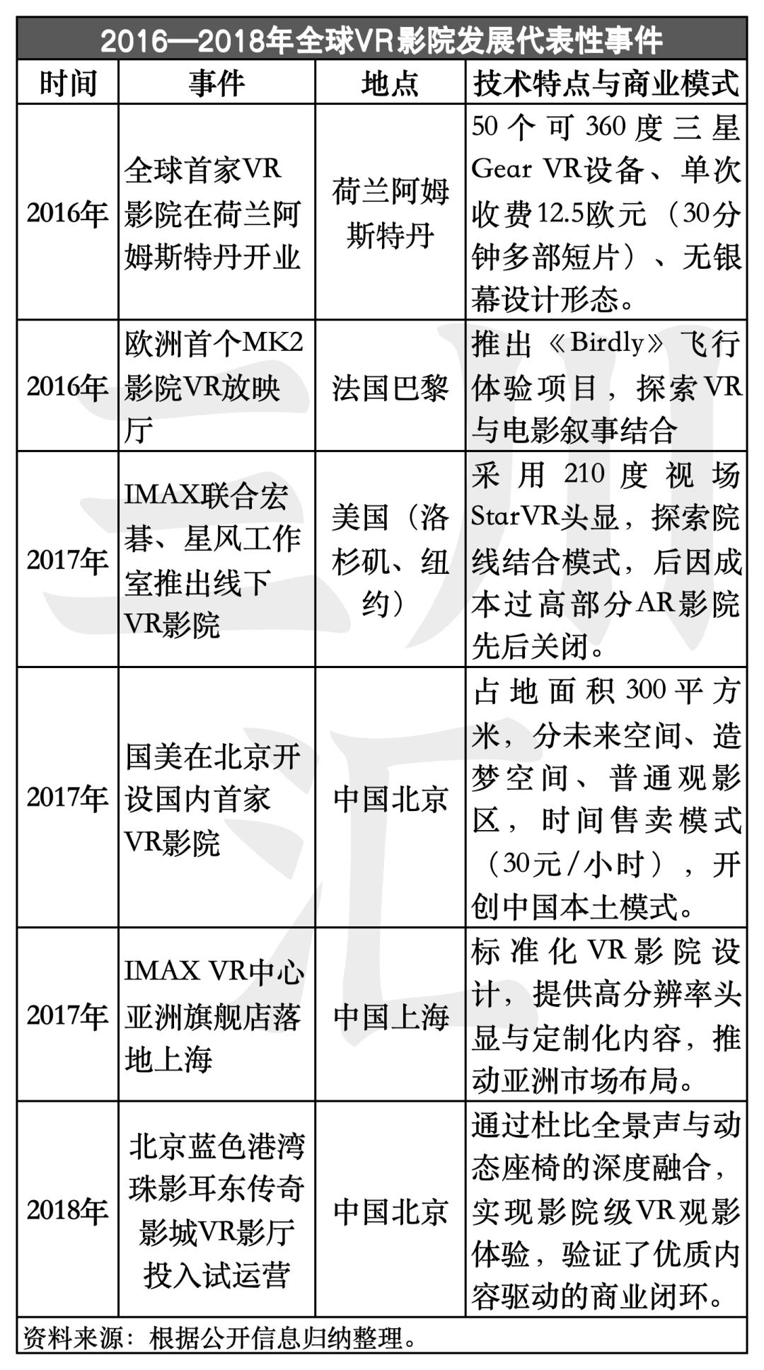 这一阶段的探索也为中国市场本土化实践提供了借鉴。 2017年6月,国内家居零售巨头国美在北京大中电器马甸店开设国内首家VR影院, 占地近300平方米,划分为未来空间、造梦空间及普通观影区三大功能区,采用每小时30元人民币的计时收费模式。同年10月,IMAX VR中心亚洲旗舰店正式登陆上海,标志着全球顶级娱乐品牌对中国市场的战略押注。