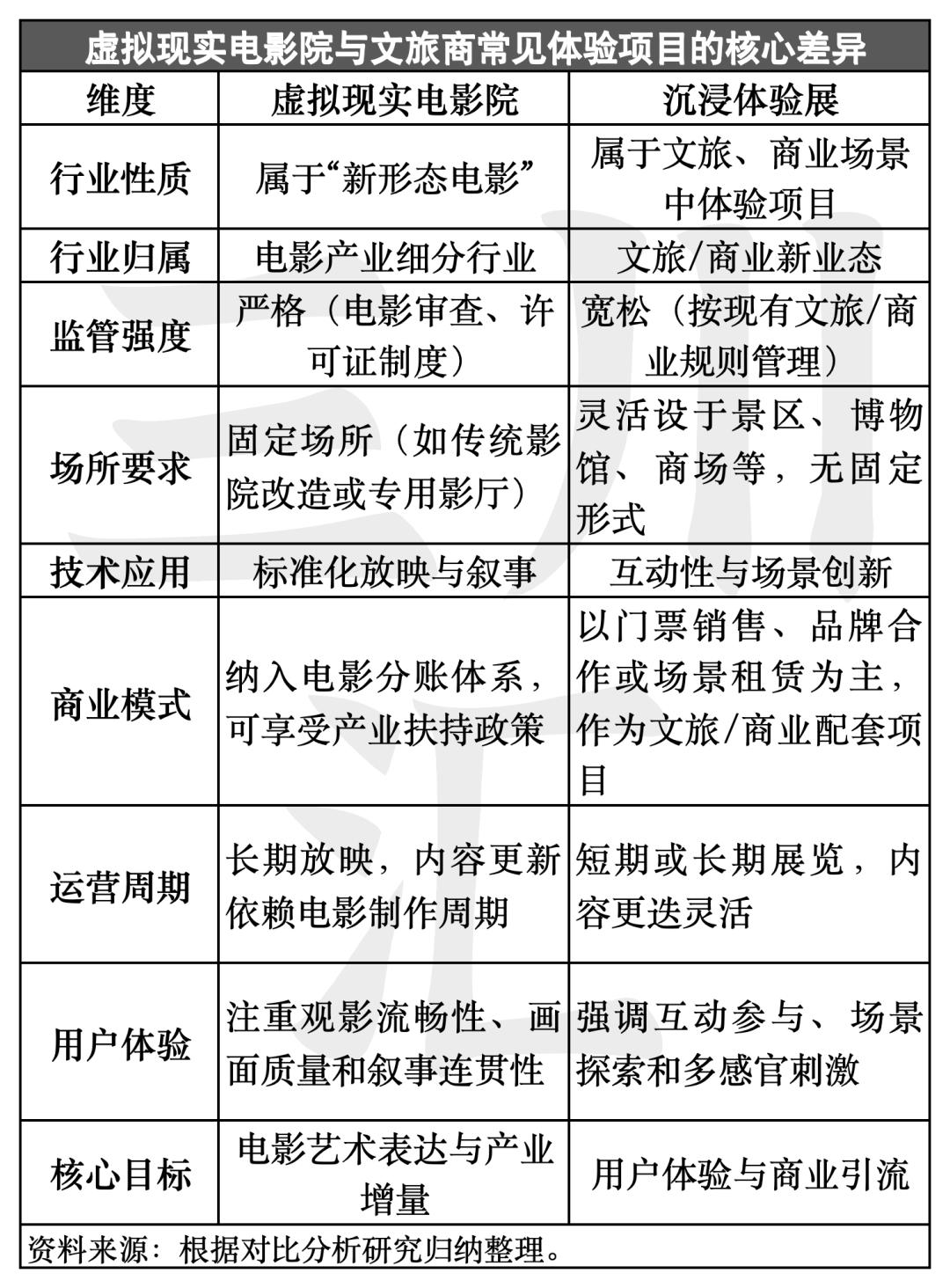 此举标志着虚拟现实电影院被纳入电影产业体系,成为独立的细分行业(新形态电影), 需遵循严格的创作、审查和放映标准,目标是推动技术与艺术融合的“增量内容”; 而沉浸体验展属于文旅商业场景的延伸业态,注重场景创新与用户互动,两者在定位、监管和技术路径上存在显著差异。